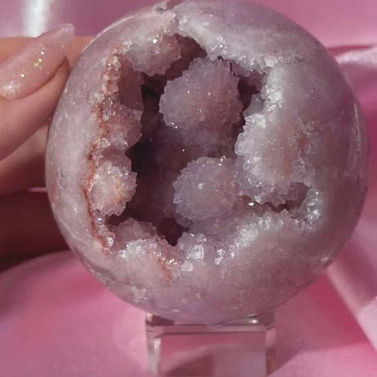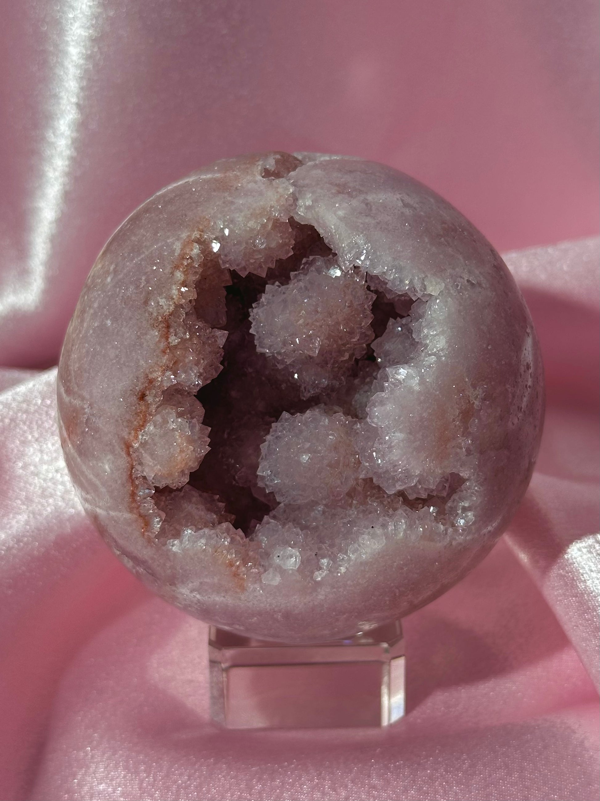 Brazilian pink amethyst x flower agate sphere with bubbly druzy cave