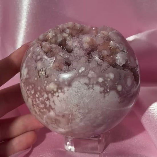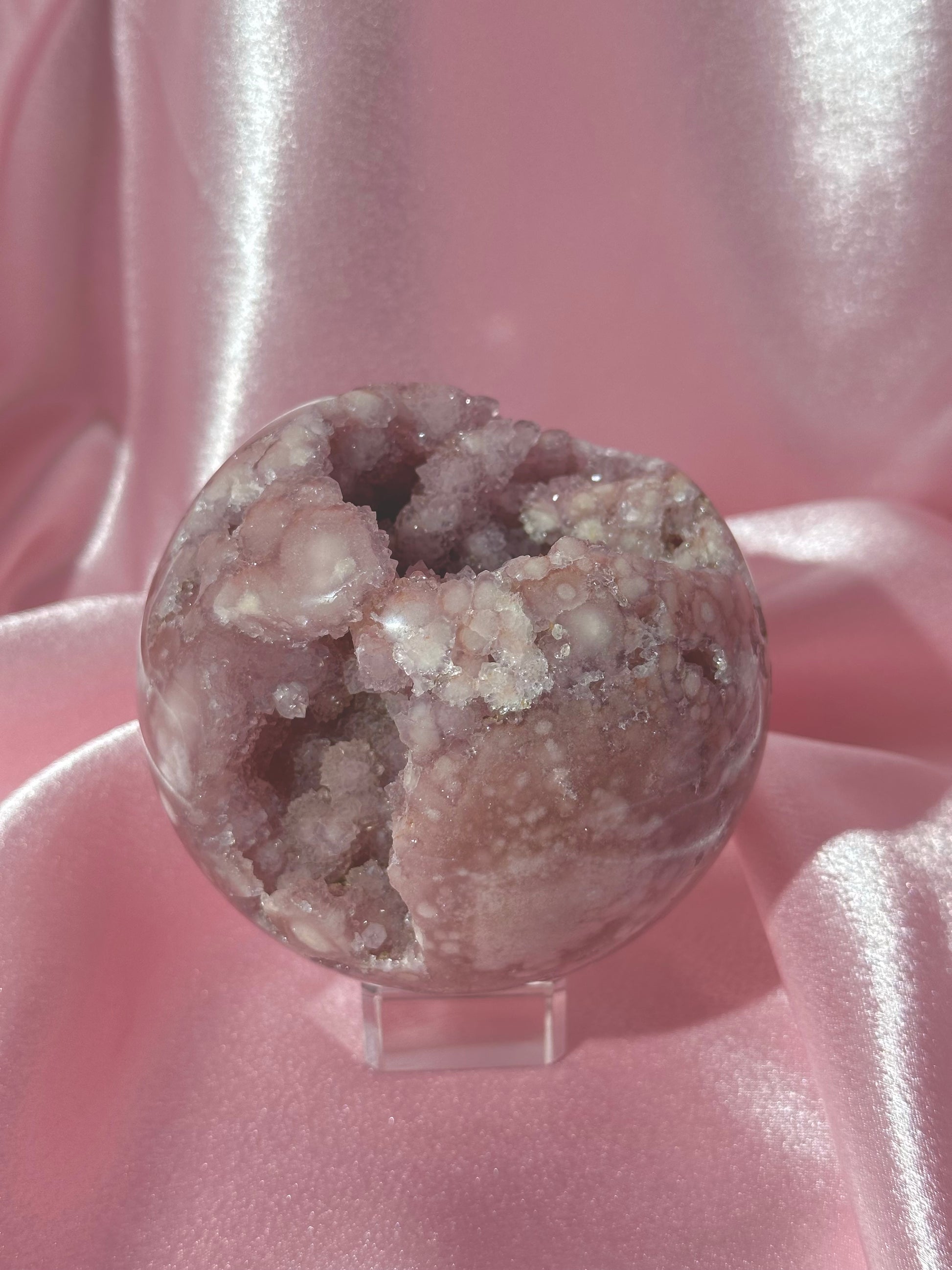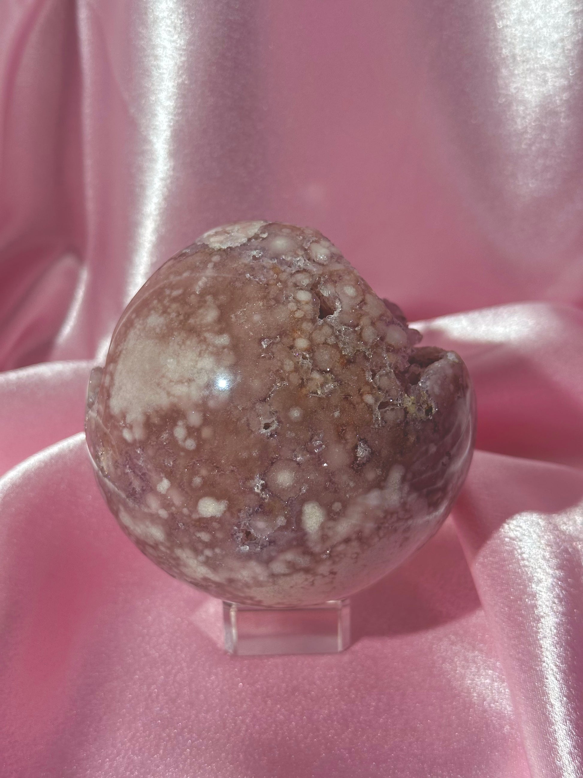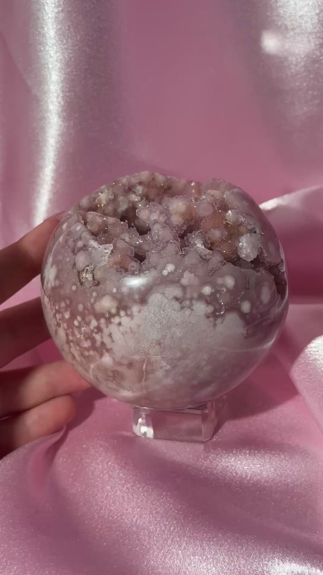 Brazilian pink amethyst x flower agate sphere with bubbly druzy cave