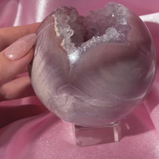 Lavender-toned glittery Brazilian pink amethyst sphere with stunning quartz cave