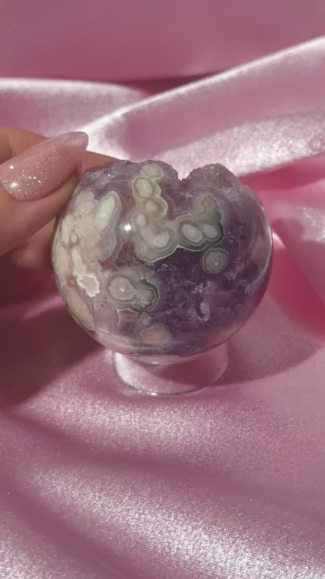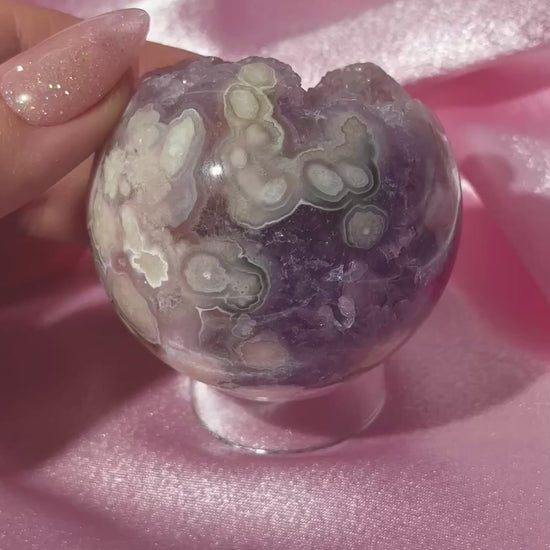Purple Brazilian pink amethyst x flower agate sphere with druzy cave