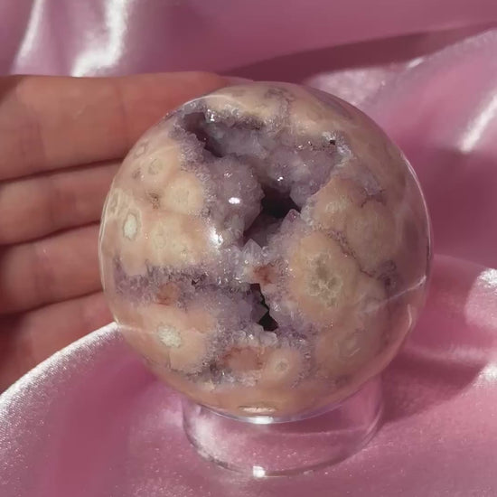 Brazilian pink amethyst x flower agate sphere with druzy cave